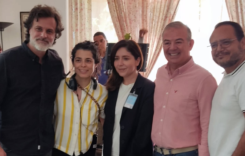 En la imagen: El Director de Turismo de Chapala, Juan Macías, con el productor Pablo Zimbrón, la actriz Diana Bovio y miembros del equipo de producción.